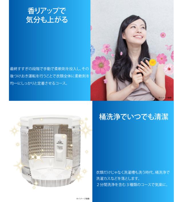 衣類だけじゃなく洗濯槽も洗う時代。桶洗浄で洗濯カスなどを落とします。2分間洗浄を含む3種類のコースで気楽に。