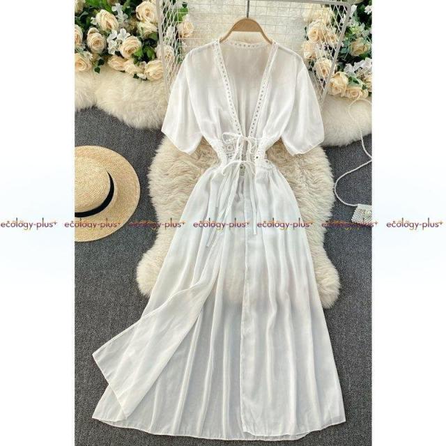 旅行撮影のホリデードレスの女神ファンシンジくり抜かれたウエストは細く、Vネックのロングカーディガン日焼け止めジャケット