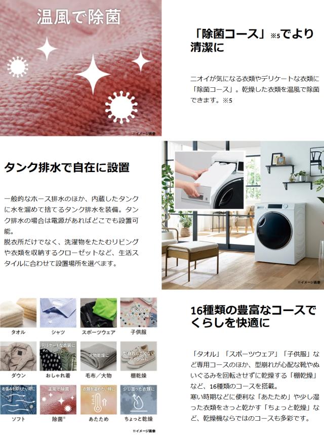 ニオイが気になる衣類やデリケートな衣類に「除菌コース」。乾燥した衣類を温風で除菌できます。[設置無料] 洗濯機 ドラム式 洗濯乾燥機 ドラム式洗濯乾燥機8.0kg/5.0kg自動投入 HDK852Z-W ホワイト 乾燥 8キロ 温水 節水 洗剤自動投入 送料無料【代引き不可】 安心延長保証対象。日立 BD-SV120JL ホワイト ビッグドラム [ドラム式洗濯乾燥機(洗濯12.0kg/乾燥6.0kg) 左開き]。タンク排水の場合は電源があればどこでも設置可能。脱衣所だけでなく、洗濯物をたたむリビングや衣類を収納するクローゼットなど、生活スタイルに合わせて設置場所を選べます。Panasonic ななめドラム洗濯乾燥機 NA-SD10HBL-C(12月14日までのご注文でご注文後10000円の値引きします。