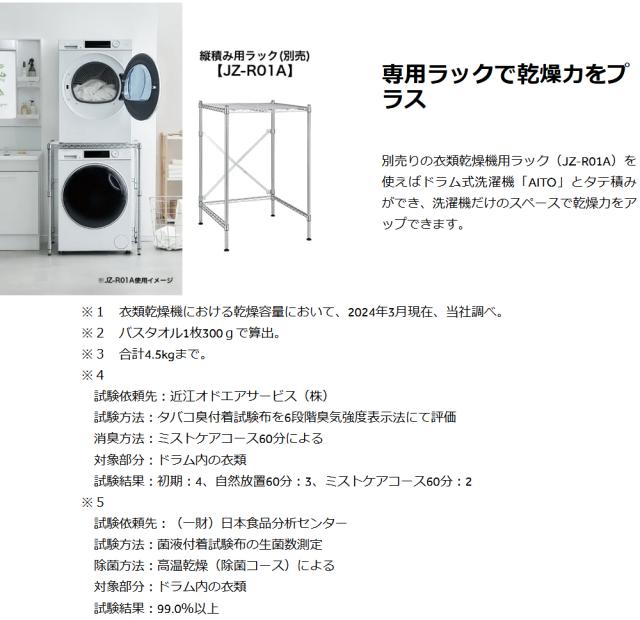 別売りの衣類乾燥機用ラック(JZ-R01A)を使えばドラム式洗濯機「AITO」とタテ積みができ、洗濯機だけのスペースで乾燥力をアップできます。