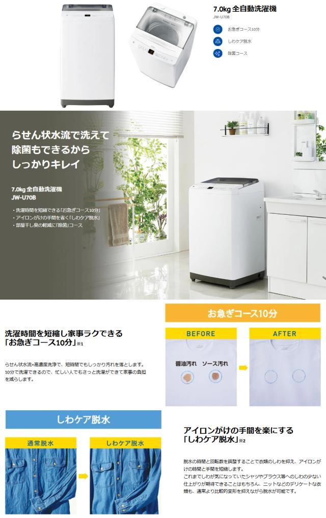 【Bエリア限定配送】JW-U70B-W(ホワイト)全自動洗濯機【7.0kg】