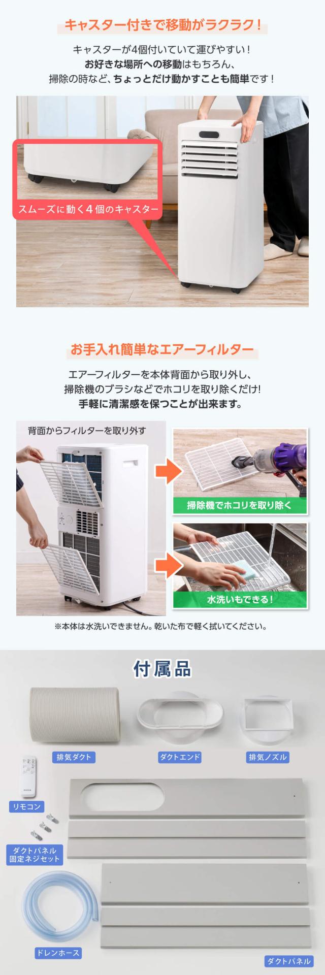 通常のエアコンと同じ冷却性を持ちながらも、どこでも簡単に移動設置ができる優れもの