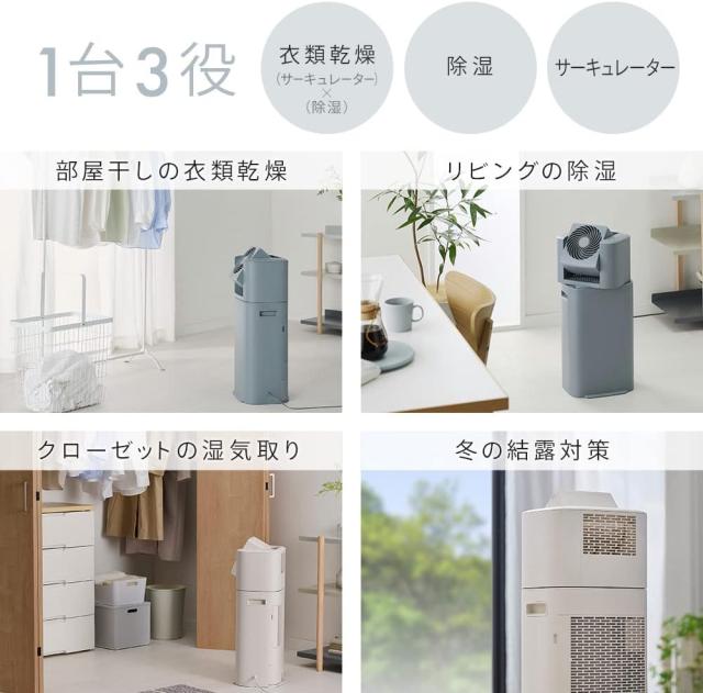 1台で3役!(サーキュレーター・除湿機・衣類乾燥機)単独機能でも運転可能で、空気の循環、攪拌やお部屋の除湿にも使えます。